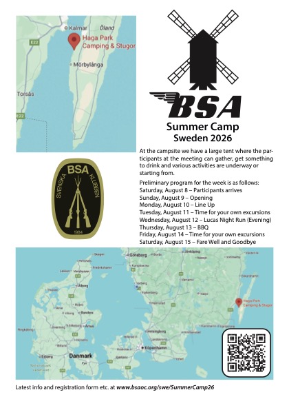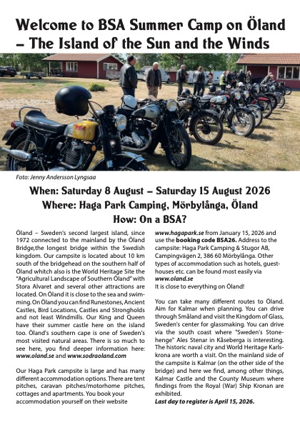 Ja, folkens, i år er vi 50 år, så i år skylder vi vår klubb å bruke BSA'ene så ofte vi kan og møtes til en verdig fest i september. Trill ut BSA'n kjør en tur og som alltid, du vil aldri angre. Vi ses. Happy new BSA year to all you BSA enthusiasts in our BSA family. This year the Norwegian club has its 50 years anniversary. We really hope it will be visible along and on the Norwegian roads and different rallies. Get that BSA out on the road, go for a spin and you will never regret it, is this years motto!